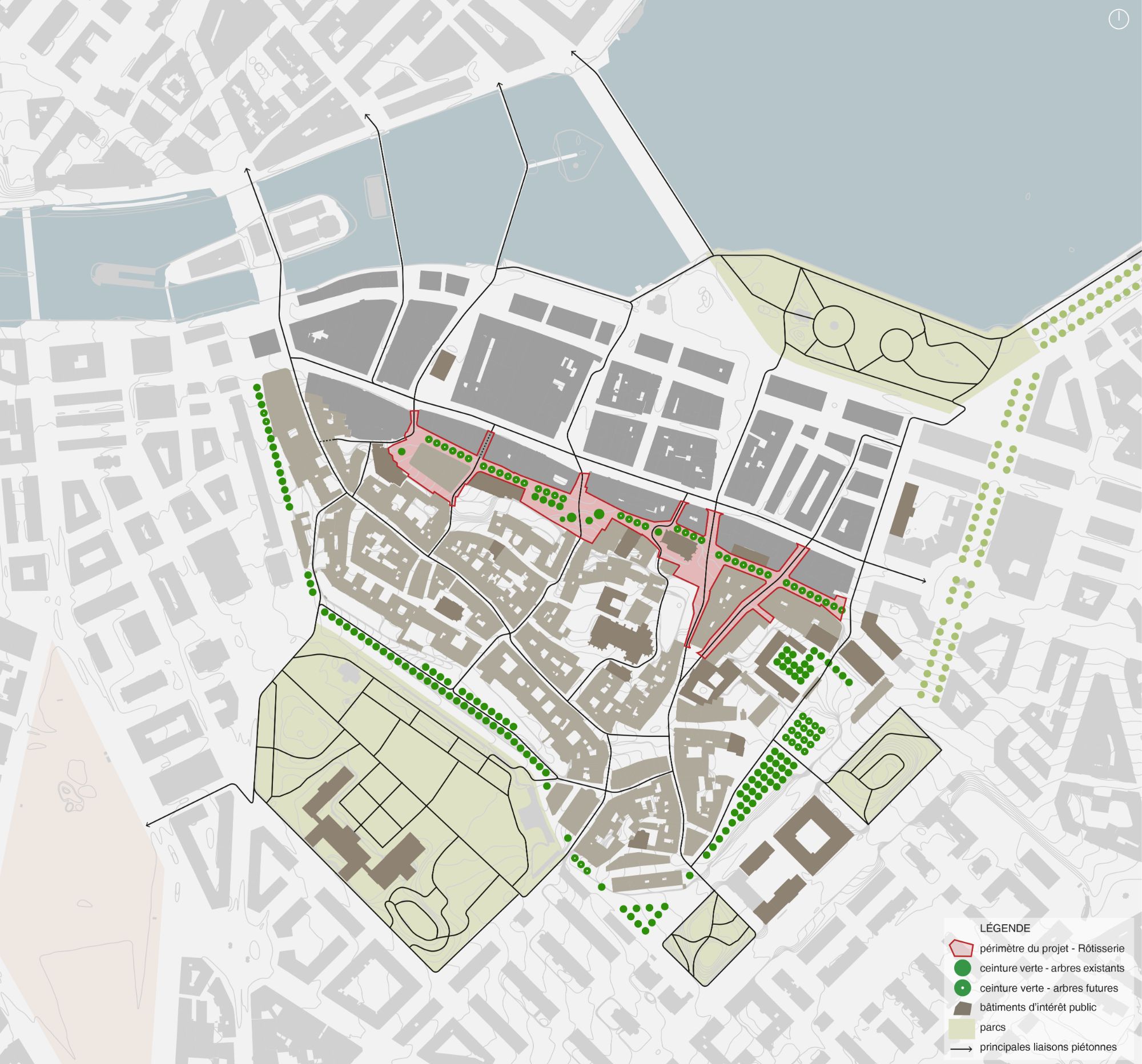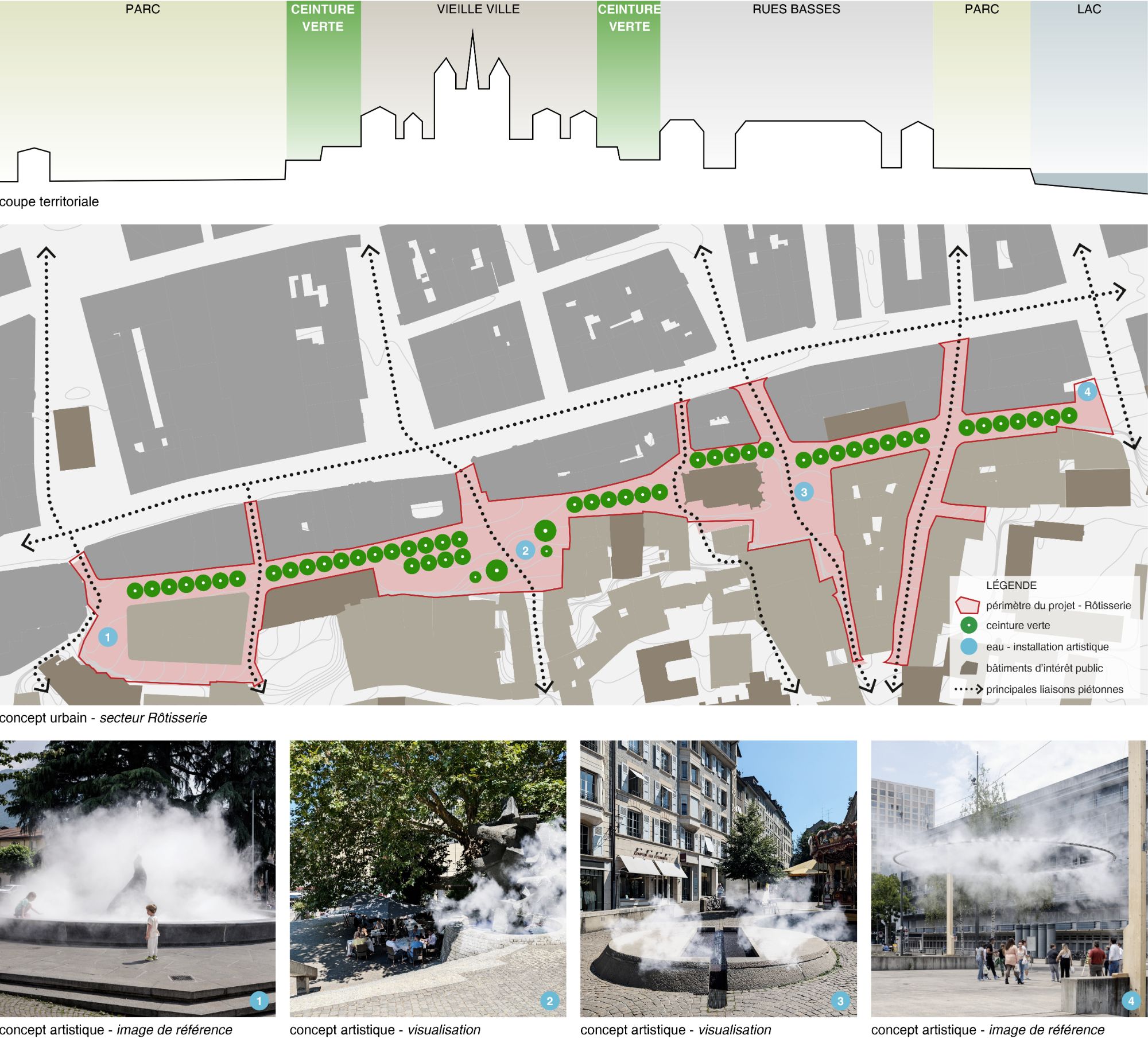 Il progetto di riqualificazione del settore della Rôtisserie, situato tra la Vieille-Ville e les Rues-Basses, interessa un’area strategica nel cuore del centro storico di Ginevra. L’intervento si fonda su una lettura urbanistica complessiva che valorizza la struttura storica della città e ne rafforza la continuità spaziale, reinterpretando in chiave contemporanea gli elementi che caratterizzano questo ambito urbano. Elemento centrale del progetto è il rafforzamento della ceinture verte che circonda la Vieille-Ville, attraverso l’inserimento di nuovi spazi alberati e superfici permeabili. Questo sistema verde si configura come infrastruttura urbana di transizione tra i diversi quartieri, contribuendo alla qualità dello spazio pubblico, al miglioramento microclimatico e alla mitigazione degli effetti delle isole di calore, in un contesto fortemente mineralizzato. La riqualifica favorisce inoltre una mobilità prevalentemente pedonale, consolidando la zona a traffico limitato e migliorando le connessioni trasversali tra la città alta e quella bassa. La riduzione dello spazio destinato al traffico veicolare consente di restituire centralità ai percorsi pedonali e agli spazi di incontro, mantenendo al contempo l’accessibilità per le funzioni indispensabili. Nel suo insieme, il progetto propone una visione integrata e sostenibile del centro storico, capace di coniugare patrimonio, spazio pubblico, mobilità dolce e qualità urbana, rafforzando l’identità del settore della Rôtisserie come luogo di connessione, di vita quotidiana e di relazione tra storia e città contemporanea.