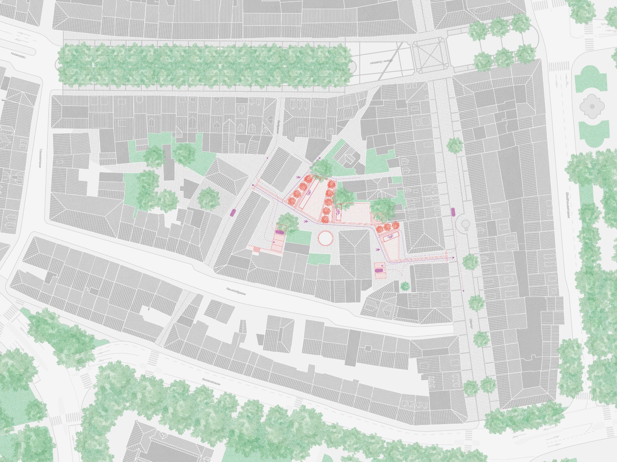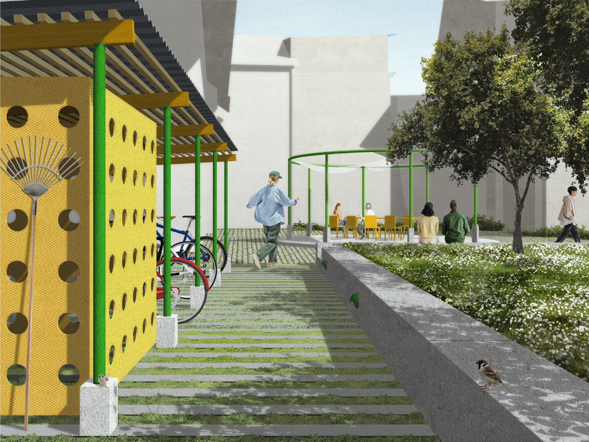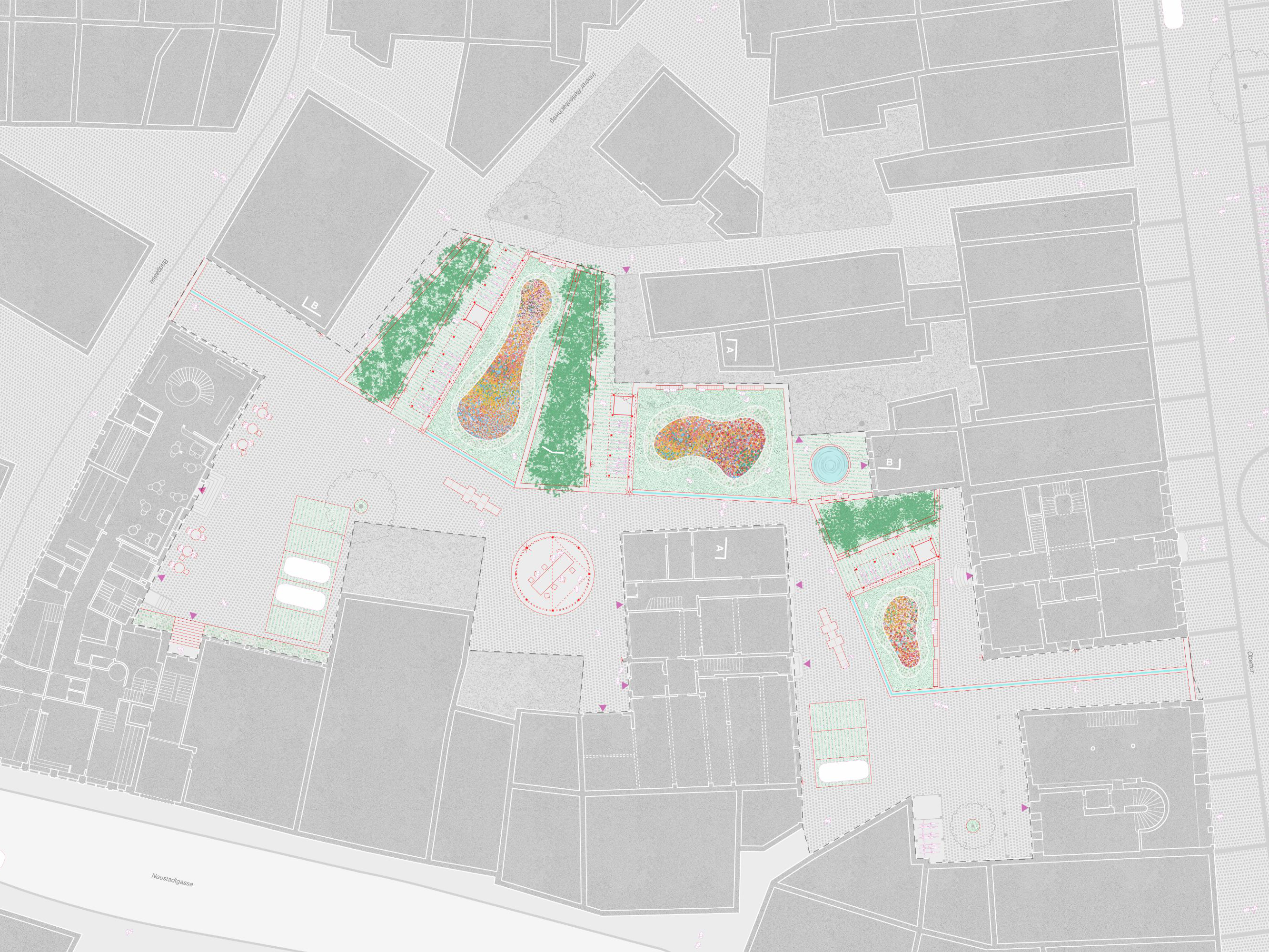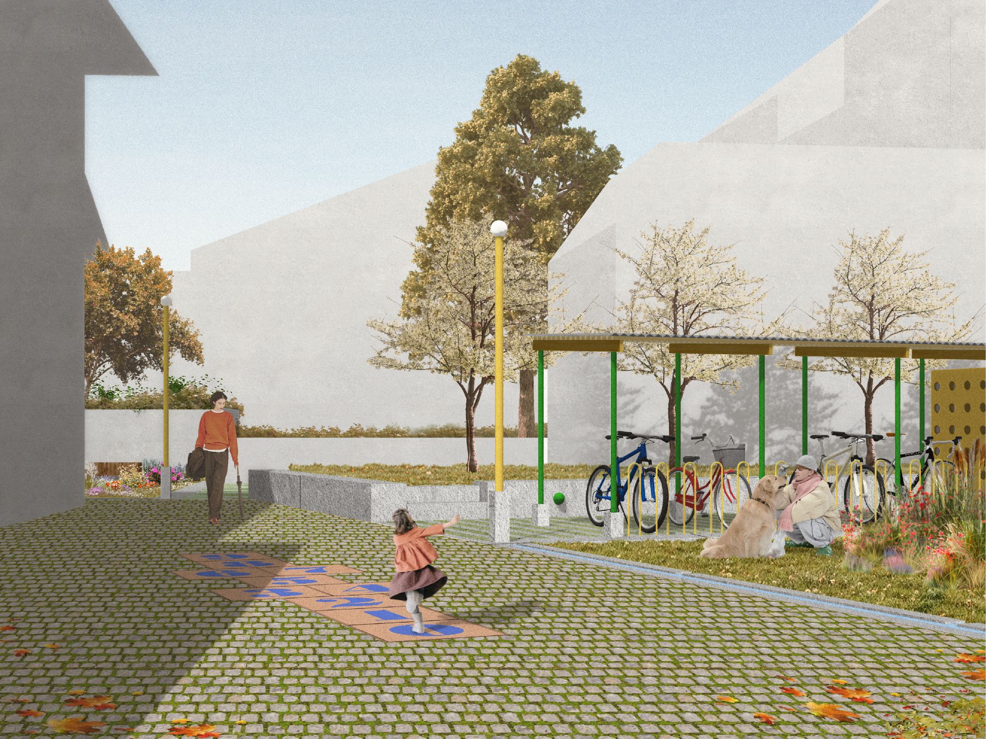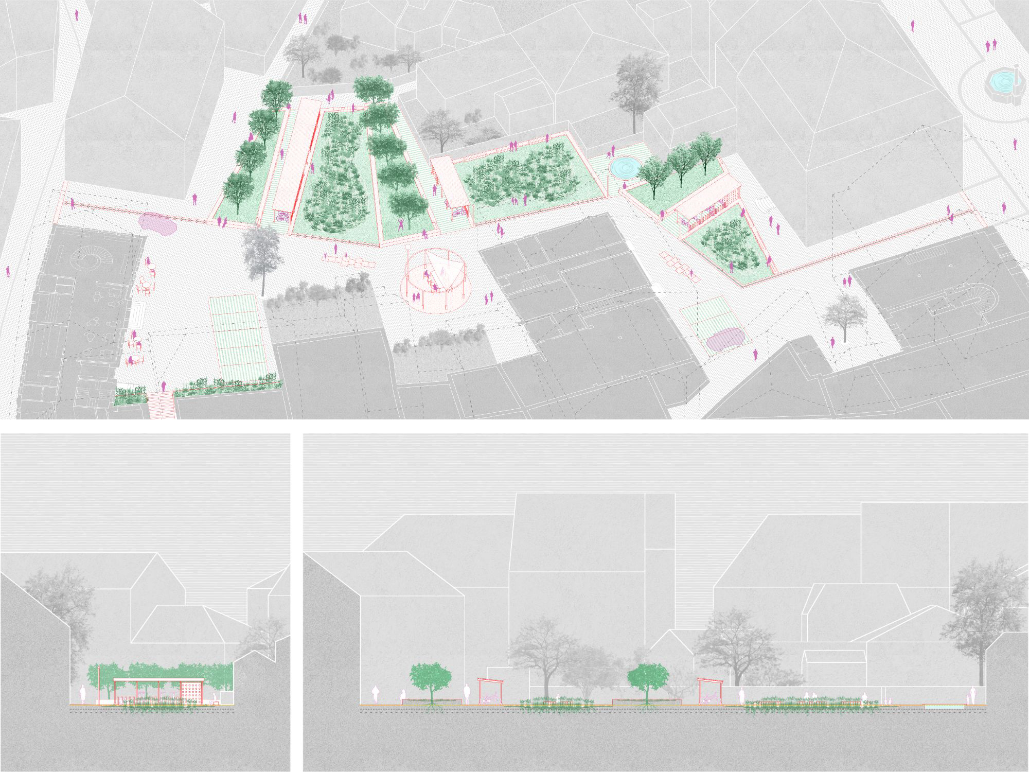 Il progetto nasce nell’ambito di un concorso indetto dalla Città di Winterthur per la riqualificazione dell’area di Obertor, oggi occupata da un’ampia superficie asfaltata adibita a parcheggio. L’obiettivo del Comune è smantellare l’attuale configurazione e trasformarla in uno spazio pubblico e semi-pubblico di qualità, sostenibile e inclusivo. La proposta si sviluppa lungo un asse centrale lineare, rappresentato da una canaletta di raccolta delle acque meteoriche che connette il cortile di Obertor al contesto urbano circostante, in particolare alle direttrici di Obertor e Badgasse. Lo spazio è articolato in due aree principali: a est superfici aperte per passaggi pedonali e veicolari con accessi flessibili agli edifici; a ovest aree multifunzionali di qualità, integrate con giardini privati e arricchite da frutteti, giardini della pioggia ed elementi d’acqua. Strutture leggere come padiglione, posti bici coperti e spazi di servizio creano un continuum tra pubblico e privato, favorendo la mobilità lenta e sostenibile. Gli interventi paesaggistici valorizzano il microclima e la biodiversità urbana, i sistemi di gestione sostenibile delle acque piovane migliorano resilienza ambientale e qualità dello spazio. L’insieme costituisce un cortile urbano inclusivo e multifunzionale, capace di migliorare il benessere della comunità e la qualità dello spazio aperto nel cuore della città.
