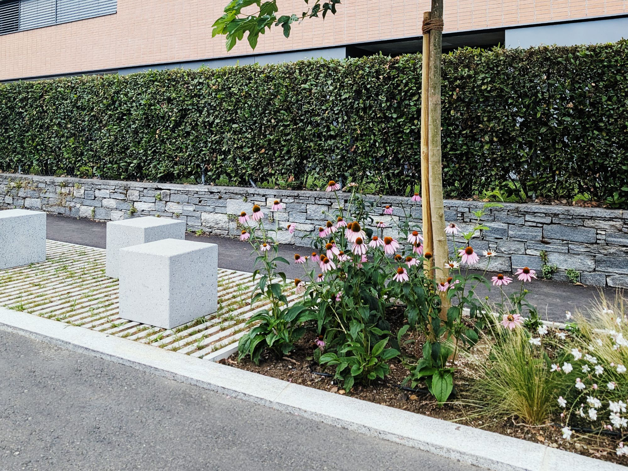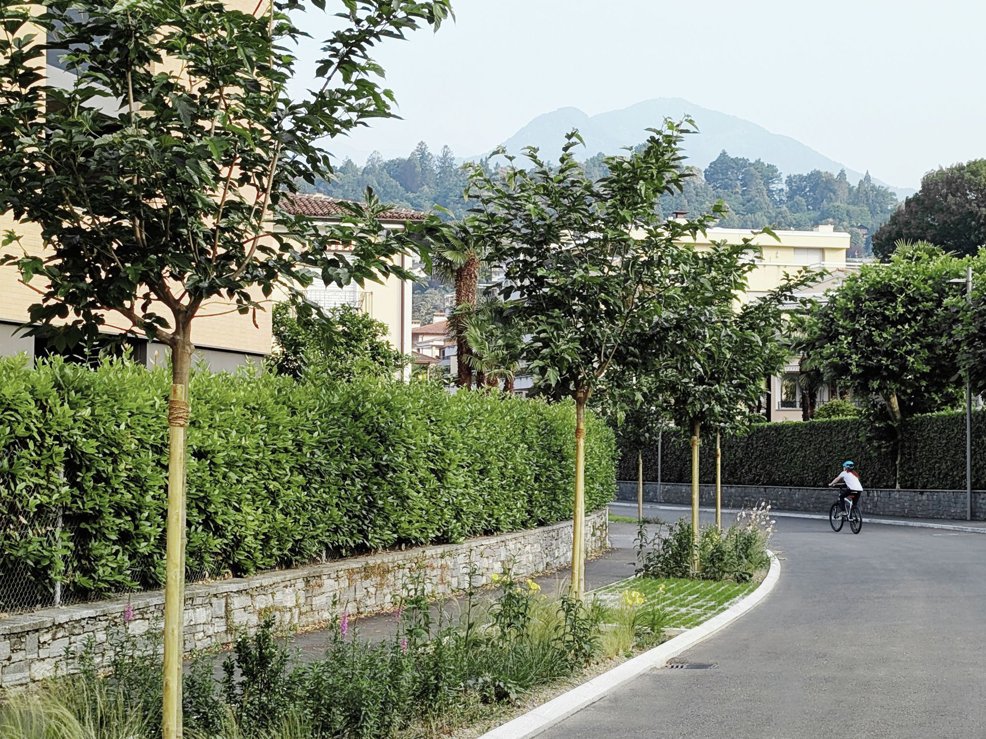 Il progetto riguarda la riqualificazione stradale di una zona residenziale nel comune di Ascona, con l’obiettivo di migliorare sia la sicurezza e la qualità della mobilità lenta, in particolare dei pedoni, sia la gestione del traffico veicolare. La riqualificazione prevede infatti il restringimento della carreggiata per moderare la velocità dei veicoli e rendere la strada più sicura, e l’ampliamento delle superfici pedonali, integrando spazi verdi, aree di sosta e parcheggi in un disegno urbanistico armonico e razionale. Il progetto punta a creare un ambiente urbano accogliente e funzionale, dove le esigenze della mobilità quotidiana si conciliano con la qualità dello spazio pubblico. Tra le principali misure adottate figurano: la piantumazione di alberi ad alto fusto, l’inserimento di aree verdi con piante perenni e la realizzazione di posteggi e aree di sosta pedonali con pavimentazioni permeabili. Particolare attenzione è stata rivolta all’integrazione del concetto di “città spugna”: le aree verdi e le pavimentazioni drenanti contribuiscono a raccogliere l’acqua piovana, ridurre l’effetto isola di calore, favorire la biodiversità e migliorare il comfort microclimatico. In questo modo, il progetto non solo aumenta la sicurezza e la fruibilità della strada, ma trasforma lo spazio pubblico in un luogo più fresco, vivibile e sostenibile, valorizzando il legame tra la zona residenziale e le aree di interesse ricreativo e turistico circostanti.