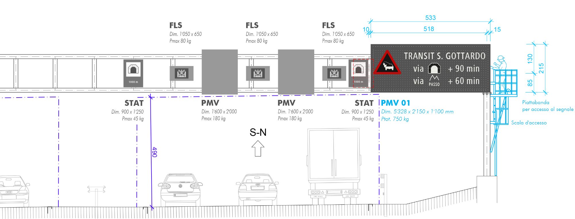 La corsia preferenziale Airolo/Passi (CUPRA) è un’infrastruttura dinamica realizzata lungo l’A2 tra Quinto e Airolo, concepita per gestire i flussi veicolari diretti oltre il Gottardo nei mesi estivi mediante l’utilizzo temporaneo della corsia di emergenza, consentendo ai veicoli diretti verso il Passo del San Gottardo di evitare le code in prossimità del portale sud della galleria. Testata negli ultimi tre anni con un impianto provvisorio, la soluzione ha dimostrato efficacia nella gestione dei picchi stagionali, contribuendo a ridurre la pressione sulla galleria autostradale, a contenere il traffico sulla rete cantonale e a migliorare la distribuzione dei flussi tra traforo e valico alpino. La CUPRA si estende per circa 8 km a partire dallo svincolo di Quinto e sarà attivata nella configurazione definitiva a maggio 2026, in concomitanza con l’apertura stagionale del Passo del San Gottardo, introducendo il prolungamento della terza corsia oltre Quinto così che la corsia di destra diventi direttamente CUPRA senza cambi di corsia, la separazione fisica mediante paletti flessibili e demarcazioni dedicate per aumentare la sicurezza, una corsia di aggiramento dell’area di servizio di Stalvedro per garantire continuità del tracciato, la gestione temporanea tramite segnaletica luminosa e regolazione dinamica dei limiti di velocità e pannelli a messaggio variabile per comunicare lo stato della corsia e il tempo risparmiato percorrendo il Passo, con integrazione in corso nei sistemi di navigazione GPS per assicurarne la corretta rappresentazione digitale.