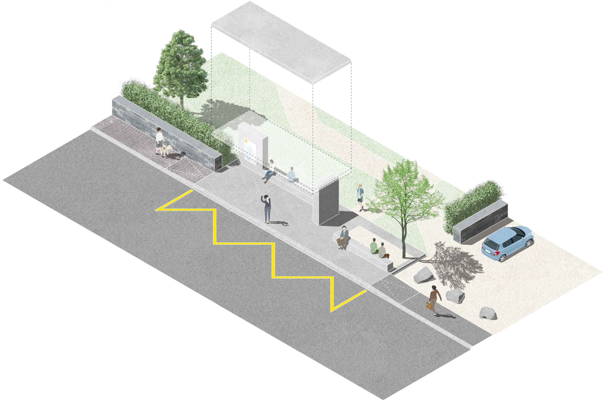 L’intervento si inserisce nel progetto di massima della misura ML 8.2.1 del PALoc, con l’obiettivo di rafforzare la qualità urbana e la funzionalità degli spazi pubblici lungo il fronte lago e nel nucleo storico. L’analisi territoriale ha evidenziato il ruolo strategico degli spazi pubblici esistenti e delle connessioni con il Lago Maggiore, oggi frammentate e poco leggibili, ma caratterizzate da un elevato potenziale di valorizzazione. Elemento centrale del progetto è la riqualifica e l’unificazione delle fermate del trasporto pubblico, ripensate come nodo urbano tra il Municipio, i giardini pubblici e il porto turistico. La nuova fermata bus è concepita come infrastruttura accessibile e inclusiva, conforme alla normativa LDis, con banchine adeguate, attraversamenti pedonali protetti e dispositivi che migliorano la sicurezza e la leggibilità dello spazio stradale. Una pensilina integrata nel disegno urbano, accompagnata da sedute e alberature, contribuisce a qualificare l’attesa e a rafforzare il legame visivo e funzionale tra strada, verde e lago. Il progetto affronta inoltre la continuità dei percorsi pedonali, la moderazione del traffico e la qualità dei materiali, attraverso pavimentazioni coerenti con il carattere storico del luogo e interventi mirati sul campo stradale. Nel suo insieme, l’intervento restituisce coerenza e identità allo spazio pubblico, migliorando l’accessibilità al trasporto pubblico e valorizzando il ruolo della fermata bus come elemento urbano di connessione, servizio e incontro.