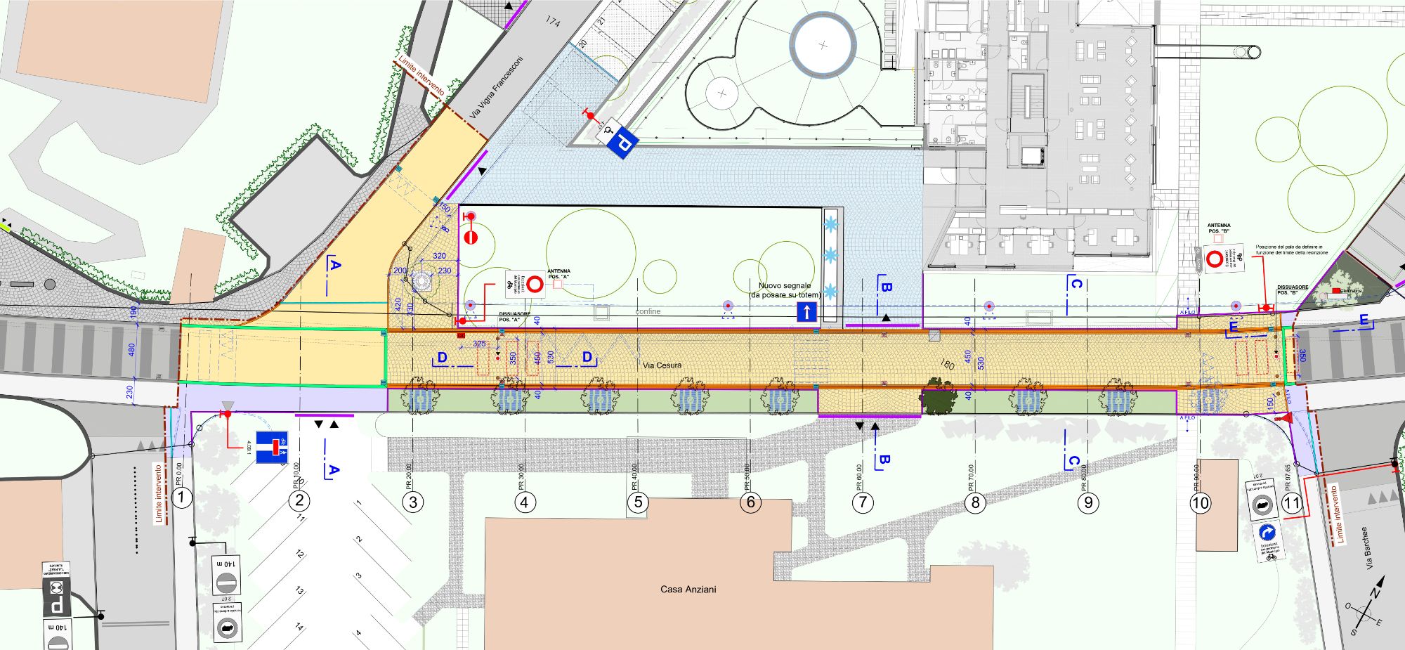 Il progetto di mobilità per il settore Cesura – Barchee – Paré affronta in modo coordinato le criticità legate all’accessibilità e alla circolazione in un ambito urbano fortemente densificato negli ultimi anni e interessato dalla realizzazione di nuovi equipaggiamenti pubblici, tra cui la nuova Casa Medicalizzata. L’intervento si fonda su un’analisi integrata della mobilità veicolare, pedonale e ciclabile, della gestione della sosta su suolo pubblico e dell’organizzazione della circolazione a scala di quartiere, con particolare attenzione alla sicurezza dei percorsi pedonali, all’accessibilità dei mezzi di soccorso e alla qualità dello spazio pubblico. A partire da uno studio esplorativo e dalla valutazione di diverse varianti, il progetto individua come soluzione strategica la pedonalizzazione del tratto centrale di via Cesura, con accessi regolamentati per gli aventi diritto e i servizi di emergenza. La proposta considera inoltre le esigenze di accessibilità durante le fasi di cantiere e il corretto dimensionamento delle aree di sosta e di carico/scarico, delineando una strategia di mobilità coerente, funzionale e sostenibile per l’intero settore.