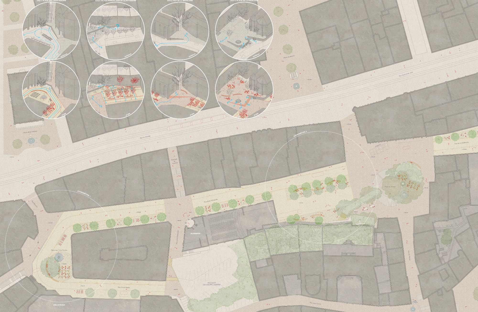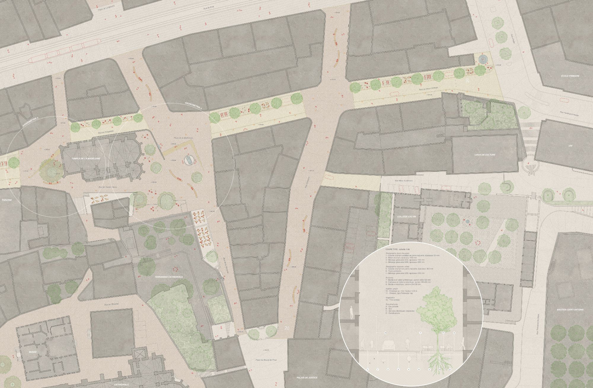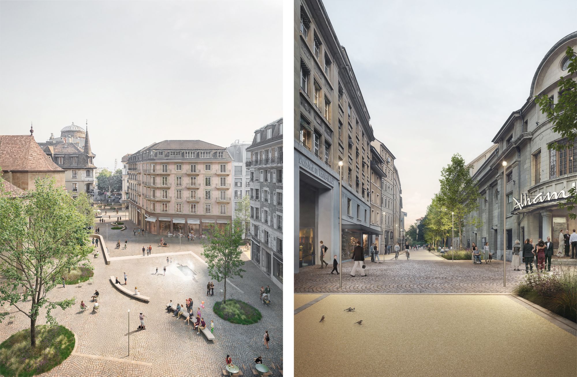 Il progetto di riqualificazione del settore della Rôtisserie, situato tra la Vieille-Ville e les Rues-Basses, interessa un’area strategica nel cuore del centro storico di Ginevra. L’intervento si fonda su una lettura urbanistica complessiva che valorizza la struttura storica della città e ne rafforza la continuità spaziale, reinterpretando in chiave contemporanea gli elementi che caratterizzano questo ambito urbano. Elemento centrale del progetto è il rafforzamento della ceinture verte che circonda la Vieille-Ville, attraverso l’inserimento di nuovi spazi alberati e superfici permeabili. Questo sistema verde si configura come infrastruttura urbana di transizione tra i diversi quartieri, contribuendo alla qualità dello spazio pubblico, al miglioramento microclimatico e alla mitigazione degli effetti delle isole di calore, in un contesto fortemente mineralizzato. La riqualifica favorisce inoltre una mobilità prevalentemente pedonale, consolidando la zona a traffico limitato e migliorando le connessioni trasversali tra la città alta e quella bassa. La riduzione dello spazio destinato al traffico veicolare consente di restituire centralità ai percorsi pedonali e agli spazi di incontro, mantenendo al contempo l’accessibilità per le funzioni indispensabili. Nel suo insieme, il progetto propone una visione integrata e sostenibile del centro storico, capace di coniugare patrimonio, spazio pubblico, mobilità dolce e qualità urbana, rafforzando l’identità del settore della Rôtisserie come luogo di connessione, di vita quotidiana e di relazione tra storia e città contemporanea.