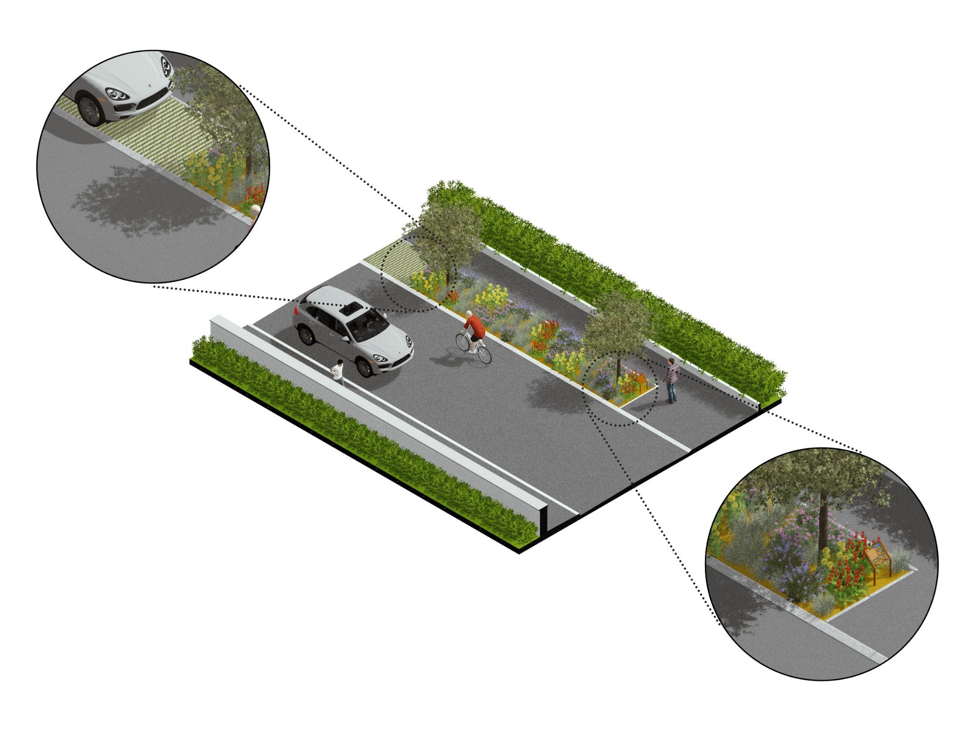 Il progetto riguarda la riqualificazione stradale di una zona residenziale nel comune di Ascona, con l’obiettivo di migliorare sia la sicurezza e la qualità della mobilità lenta, in particolare dei pedoni, sia la gestione del traffico veicolare. La riqualificazione prevede infatti il restringimento della carreggiata per moderare la velocità dei veicoli e rendere la strada più sicura, e l’ampliamento delle superfici pedonali, integrando spazi verdi, aree di sosta e parcheggi in un disegno urbanistico armonico e razionale. Il progetto punta a creare un ambiente urbano accogliente e funzionale, dove le esigenze della mobilità quotidiana si conciliano con la qualità dello spazio pubblico. Tra le principali misure adottate figurano: la piantumazione di alberi ad alto fusto, l’inserimento di aree verdi con piante perenni e la realizzazione di posteggi e aree di sosta pedonali con pavimentazioni permeabili. Particolare attenzione è stata rivolta all’integrazione del concetto di “città spugna”: le aree verdi e le pavimentazioni drenanti contribuiscono a raccogliere l’acqua piovana, ridurre l’effetto isola di calore, favorire la biodiversità e migliorare il comfort microclimatico. In questo modo, il progetto non solo aumenta la sicurezza e la fruibilità della strada, ma trasforma lo spazio pubblico in un luogo più fresco, vivibile e sostenibile, valorizzando il legame tra la zona residenziale e le aree di interesse ricreativo e turistico circostanti.