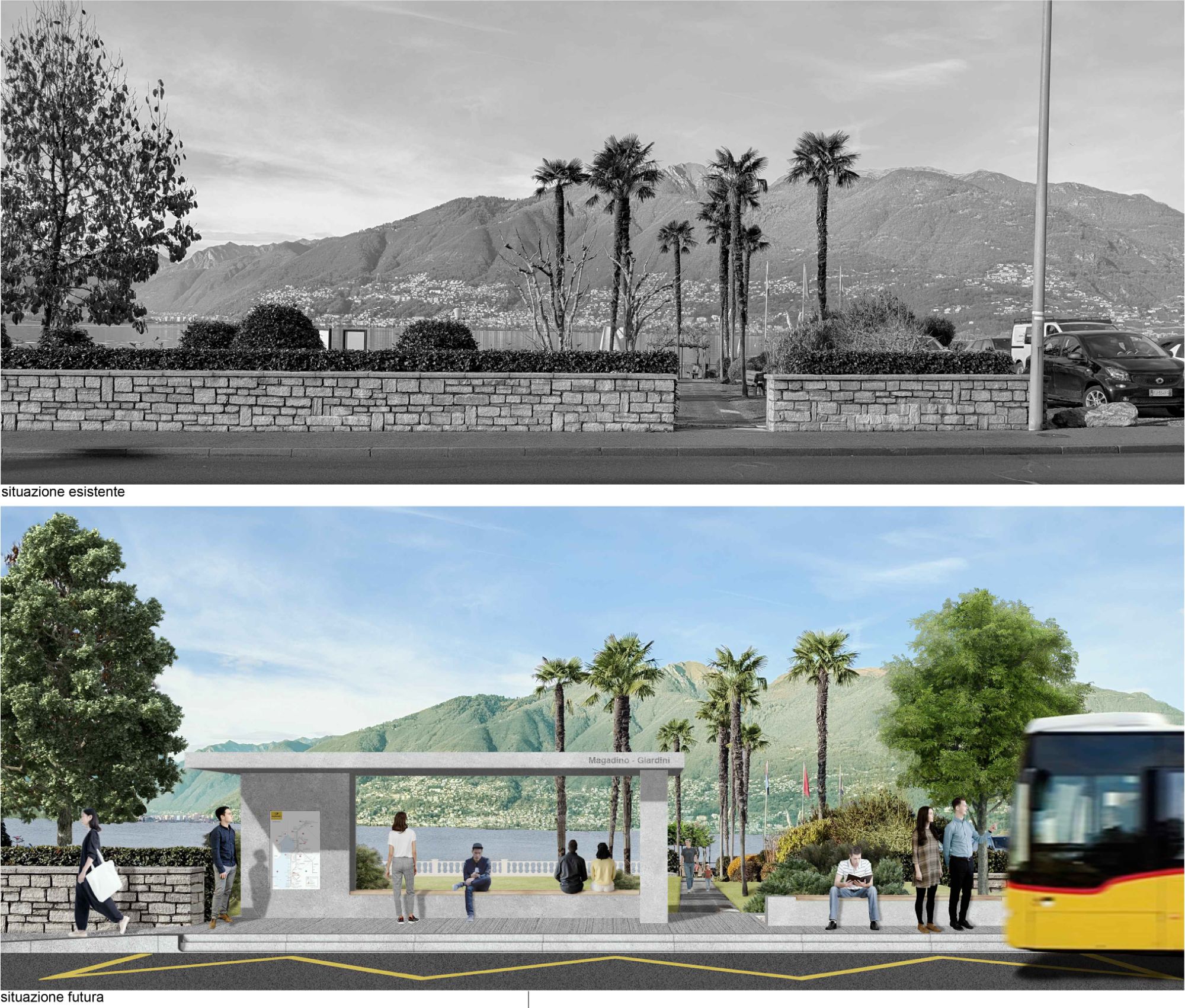 L’intervento si inserisce nel progetto di massima della misura ML 8.2.1 del PALoc, con l’obiettivo di rafforzare la qualità urbana e la funzionalità degli spazi pubblici lungo il fronte lago e nel nucleo storico. L’analisi territoriale ha evidenziato il ruolo strategico degli spazi pubblici esistenti e delle connessioni con il Lago Maggiore, oggi frammentate e poco leggibili, ma caratterizzate da un elevato potenziale di valorizzazione. Elemento centrale del progetto è la riqualifica e l’unificazione delle fermate del trasporto pubblico, ripensate come nodo urbano tra il Municipio, i giardini pubblici e il porto turistico. La nuova fermata bus è concepita come infrastruttura accessibile e inclusiva, conforme alla normativa LDis, con banchine adeguate, attraversamenti pedonali protetti e dispositivi che migliorano la sicurezza e la leggibilità dello spazio stradale. Una pensilina integrata nel disegno urbano, accompagnata da sedute e alberature, contribuisce a qualificare l’attesa e a rafforzare il legame visivo e funzionale tra strada, verde e lago. Il progetto affronta inoltre la continuità dei percorsi pedonali, la moderazione del traffico e la qualità dei materiali, attraverso pavimentazioni coerenti con il carattere storico del luogo e interventi mirati sul campo stradale. Nel suo insieme, l’intervento restituisce coerenza e identità allo spazio pubblico, migliorando l’accessibilità al trasporto pubblico e valorizzando il ruolo della fermata bus come elemento urbano di connessione, servizio e incontro.
